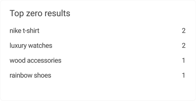 Minimize customer frustration and improve their experience by tracking and reducing the number of "no results" queries. Stock up on missing items in your catalog or configure synonyms to align with shoppers' intentions. With 1 in 3 queries resulting in no matches, it's essential to take action to keep customers coming back.