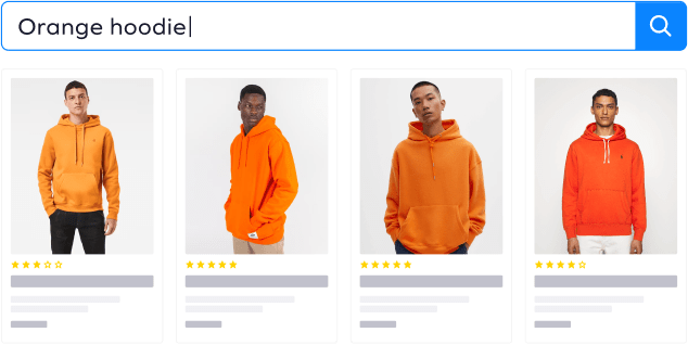Our app shows matching variant images in search results. For example, if your shoppers search for “orange hoodie” our engine automatically shows the correct hoodies with the orange variants when you have the product option or variant metafield search fields.